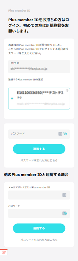 内容を確認後、Plus member IDのパスワードを入力し「連携するボタン」をクリック