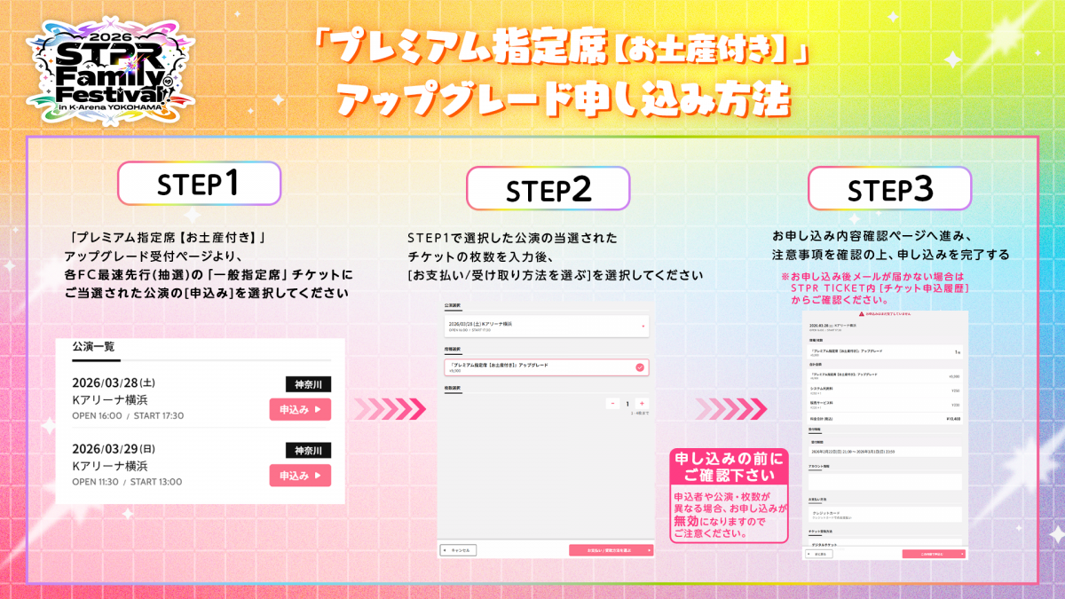 ・『プレミアム指定席【お土産付き】』アップグレード受付を申し込むには、『プレミアム指定席【お土産付き】』アップグレード受付ページにて、FC最速先行で購入した指定席チケットと「同じ公演日」を選択し、お申し込みいただく必要がございます。