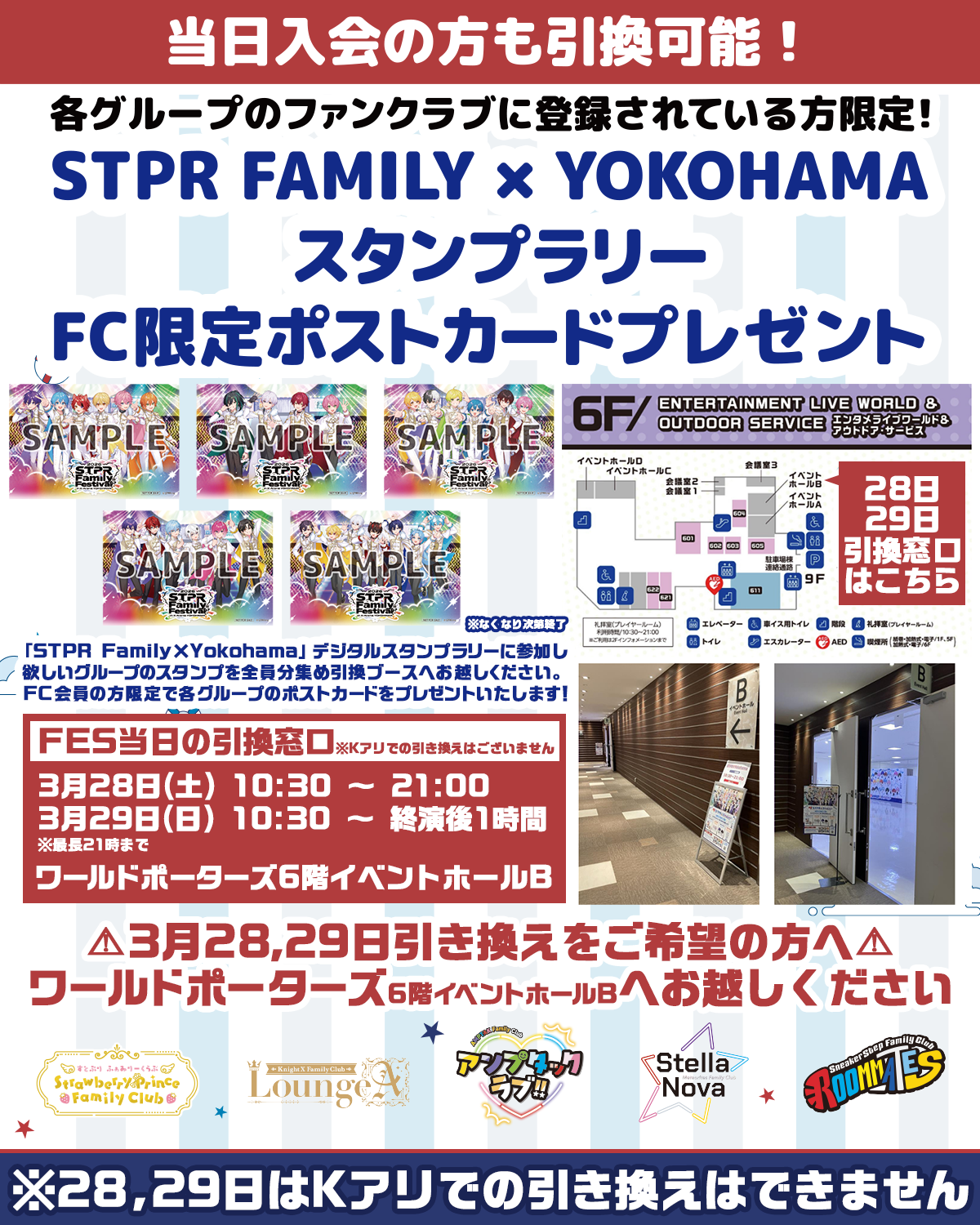 すとふぇす当日のポストカードの引換ブースはワールドポーターズ6階 イベントホールBとなります。Kアリーナでの引換は行っておりませんのでご注意ください。