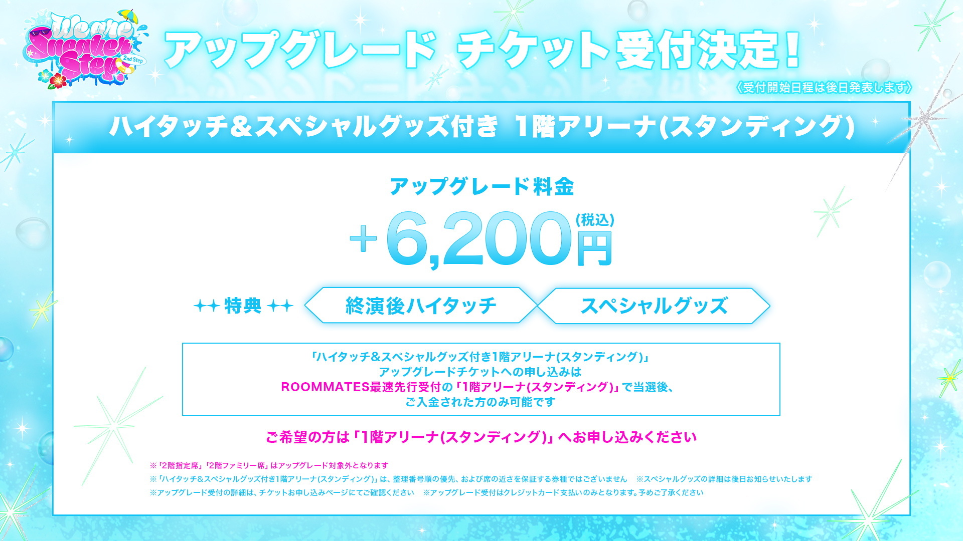 ハイタッチ&スペシャルグッズ付き1階アリーナ(スタンディング)アップグレードへのお申し込みは、ROOMMATES最速先行の「1階アリーナ(スタンディング)」に当選後、ご入金された方のみ可能です。